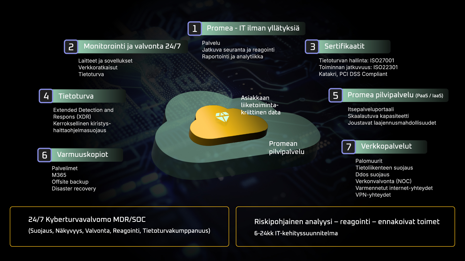 - Suojaamme pilvipalvelumme piirissä olevat asiakkaamme tietoturvapalveluillamme